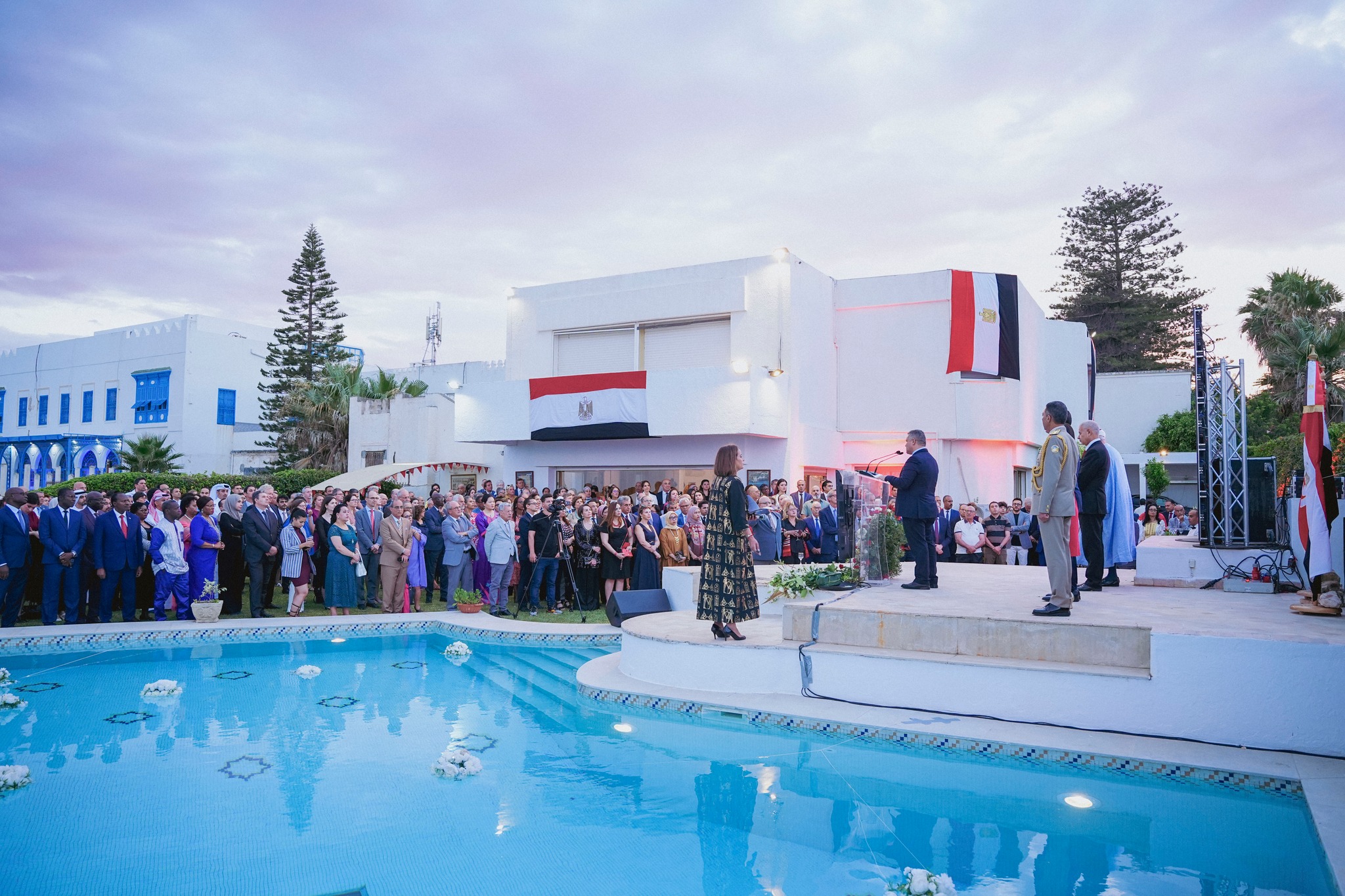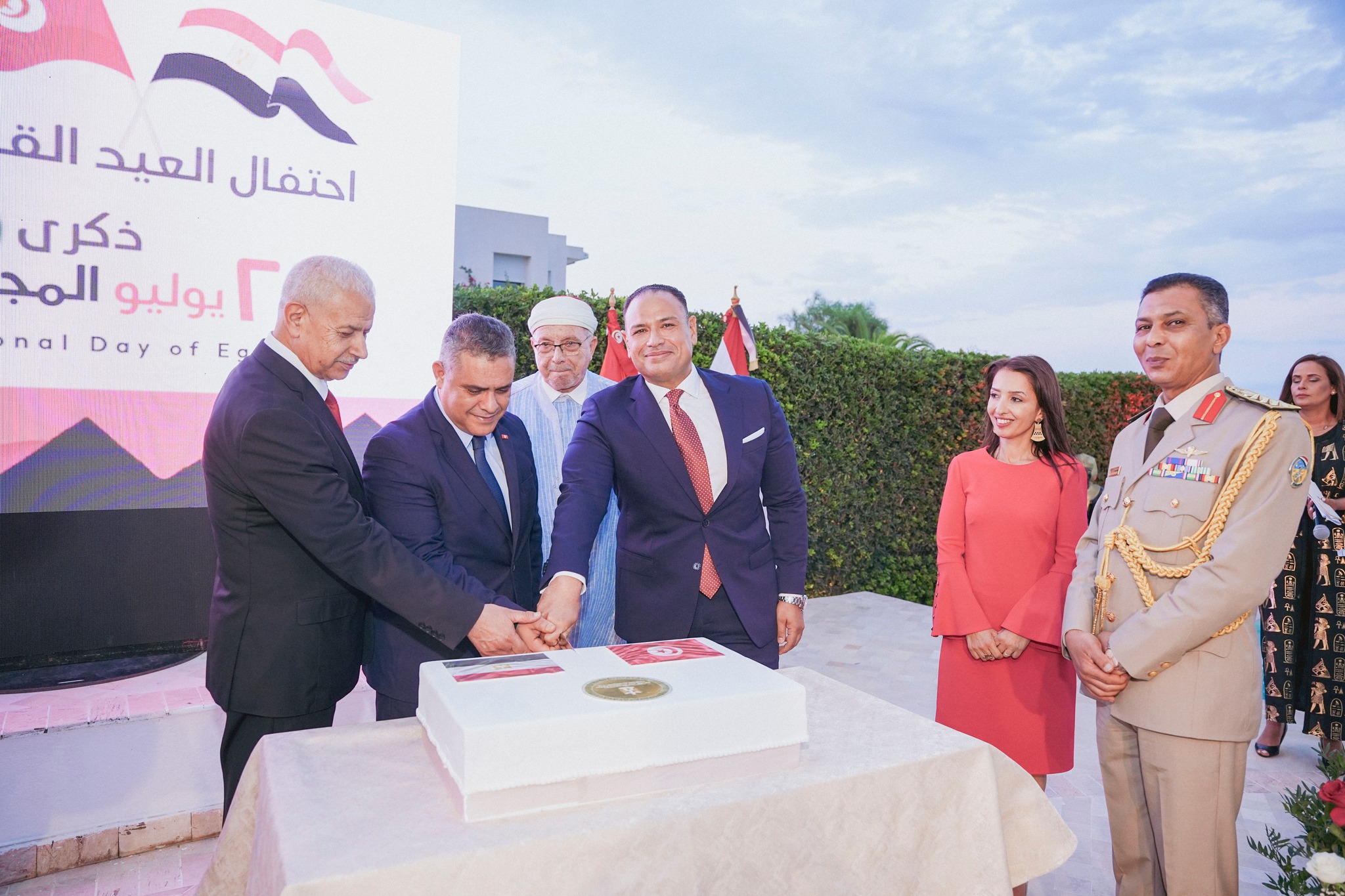 أقامت سفارة جمهورية مصر العربية في تونس يوم الخميس الموافق 10/7/2025 حفل استقبال بمناسبة الذكرى الثالثة والسبعين لثورة الثالث والعشرين من يوليو، وذلك بحضور كل من السيد خالد النوري وزير الداخلية، والسيد سمير عبيد وزير التجارة وتنمية الصادرات، وسماحة الشيخ هشام بن محمود مفتي الجمهورية التونسية، ورؤساء البعثات الدبلوماسية والمنظمات الدولية والإقليمية المعتمدة لدى تونس، وأعضاء السلك الدبلوماسي، والعديد من كبار المسؤولين الحكوميين والبرلمانيين ومن رموز وقيادات المجتمع التونسي في قطاعات الأعمال والثقافة والإعلام ومن رموز الجالية المصرية.