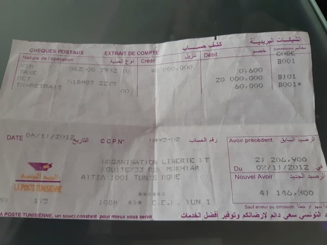 نسخة من كشف حساب بريدي يتضمن تنزيلا بمبلغ 40الف دينار تسلمتها جمعية حرية وانصاف قبل مؤتمر أصدقاء سوريا