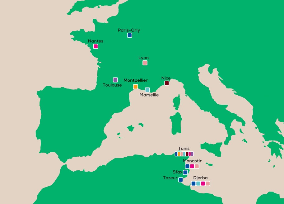 Tunis sera ainsi accessible depuis les aéroports de Toulouse (nouveauté), Paris-Orly, Nantes, Lyon, Montpellier, Marseille et Nice.